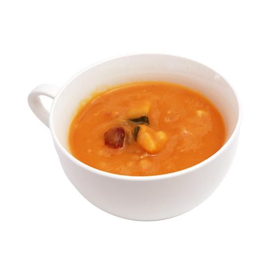 - 野菜(たまねぎ(輸入又は国産)、かぼちゃ、にんじん、じゃがいも、セロリ)、かぼちゃピューレー、赤いんげん豆、大麦、スペルト小麦、チキンガラスープ、チキンエキス、チキンブイヨン、大豆油、トマトペースト、ガーリックピューレー、食塩、酵母エキス、パセリ濃縮液、香辛料、(一部に小麦・大豆・鶏肉・豚肉・ゼラチンを含む)