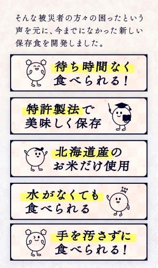 調理は一切不要。開封後そのまま食べられる北海道米100%使用した長期保存おにぎり。 LA・PITAの長期保存おにぎりは、特許製法とレトルト製法を採用しこれまでになかった画期的なレトルトご飯の食感と安全性を実現しました。