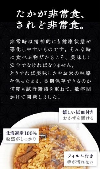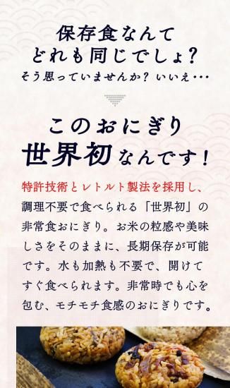 調理は一切不要。開封後そのまま食べられる北海道米100%使用した長期保存おにぎり。 LA・PITAの長期保存おにぎりは、特許製法とレトルト製法を採用しこれまでになかった画期的なレトルトご飯の食感と安全性を実現しました。
