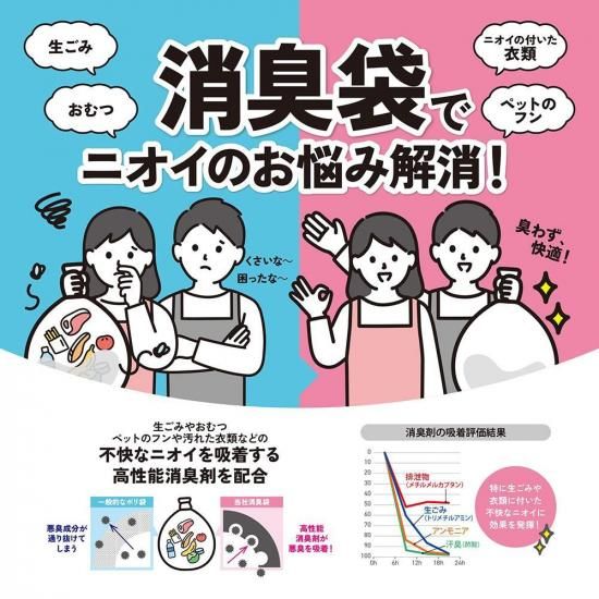 特殊消臭剤配合で強力消臭! 「特殊消臭剤使用 消臭袋10L(10枚入)AS15」は、気になるニオイをしっかり閉じ込める高性能な消臭袋です。袋自体に消臭成分を練り込んでおり、開封時や処分時の嫌なニオイを大幅に軽減します。 10リットルサイズで使用しやすく、おむつ・ペットの排せつ物・生ごみなどの処理にも最適。厚手で破れにくく、衛生的に処理できます。 【用途例】 ・赤ちゃんの紙おむつの処分 ・ペットの排せつ物処理 ・介護用おむつの処理 ・生ごみなどの処理 ・防災備蓄品として ・アウトドア、車内でのゴミ処理にも ≪特殊消臭剤使用 消臭袋10L(10枚入)≫