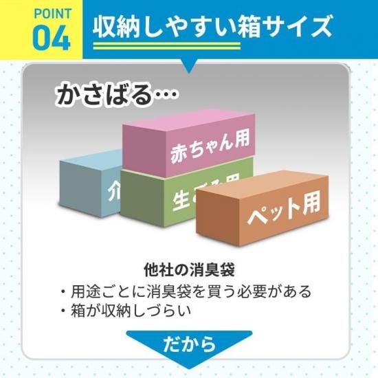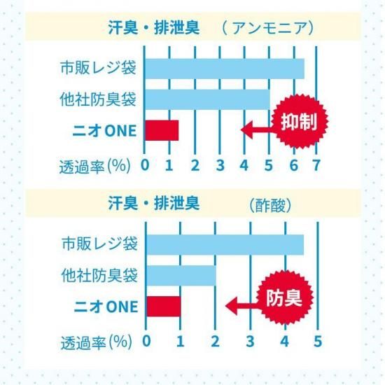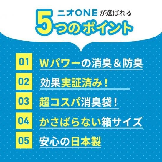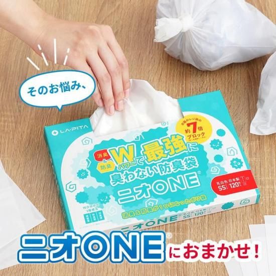 消臭と防臭が1つになった特許技術の3層フィルム採用 おむつ、生ごみ、ペット、衣類などニオイの気になる様々なシーンで活躍。消臭層と防臭層のフィルムが別々に存在することで、様々な悪臭成分を効果的に遮断。薄型パッケージで収納に便利。 ※少数でご購入の場合メール便での配送となります。日時指定、代引きはご利用いただけません。 ≪消臭袋 ニオONE 120枚 SSサイズ≫