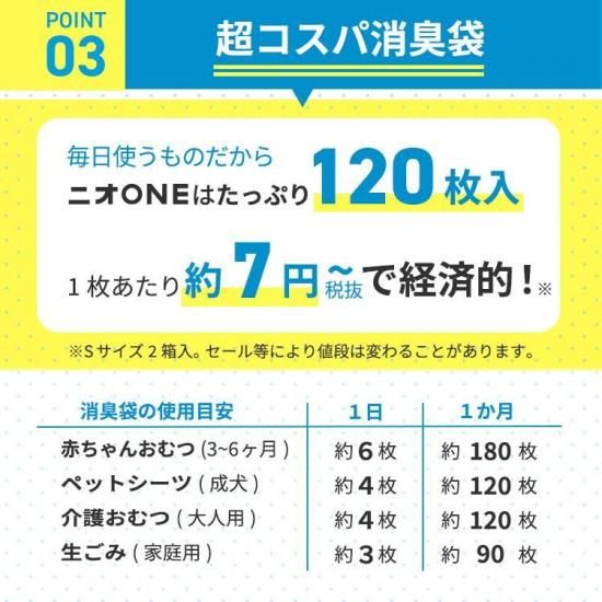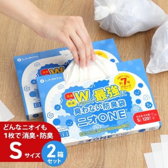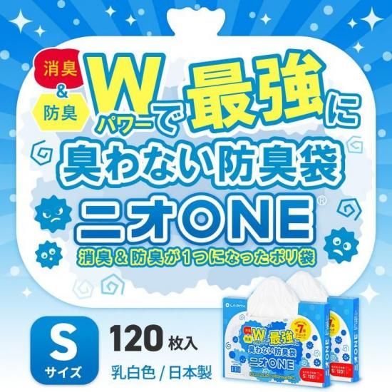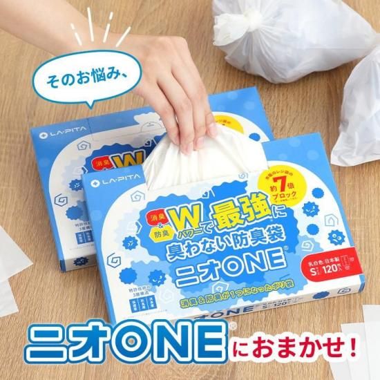 消臭と防臭が1つになった特許技術の3層フィルム採用 おむつ、生ごみ、ペット、衣類などニオイの気になる様々なシーンで活躍。消臭層と防臭層のフィルムが別々に存在することで、様々な悪臭成分を効果的に遮断。薄型パッケージで収納に便利。 ※少数でご購入の場合メール便での配送となります。日時指定、代引きはご利用いただけません。 ≪消臭袋 ニオONE 120枚 Sサイズ 2箱≫